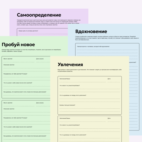 Рабочие тетради для подростков: поиск предназначения через самоанализ, определение сильных сторон и личных ценностей.